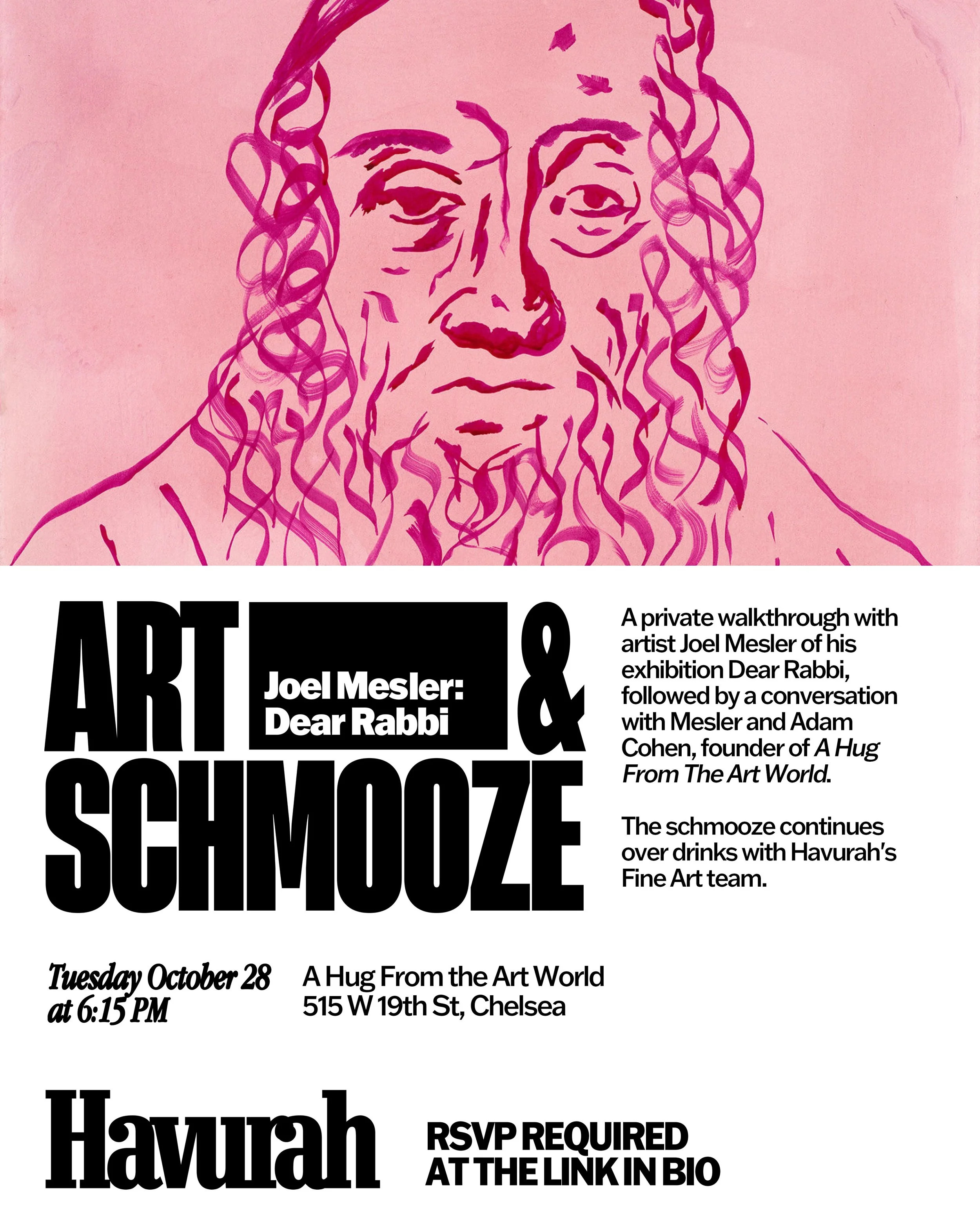 Meet us in Chelsea for a private walkthrough with artist Joel Mesler of his exhibition Dear Rabbi, followed by a conversation with Mesler and Adam Cohen, founder of the project space A Hug From The Art World. The schmooze continues over drinks with Havurah's Fine Art team.