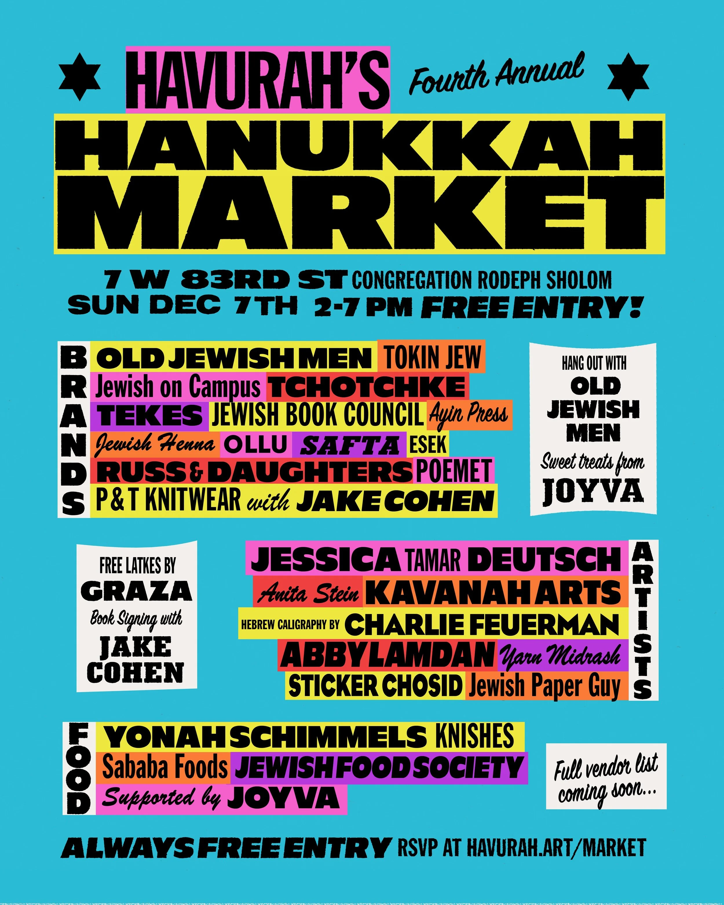 Join us for a night of light with over 30 Jewish brands and artists in the Upper West Side. Unique gifts, free latkes, and infinite joy.